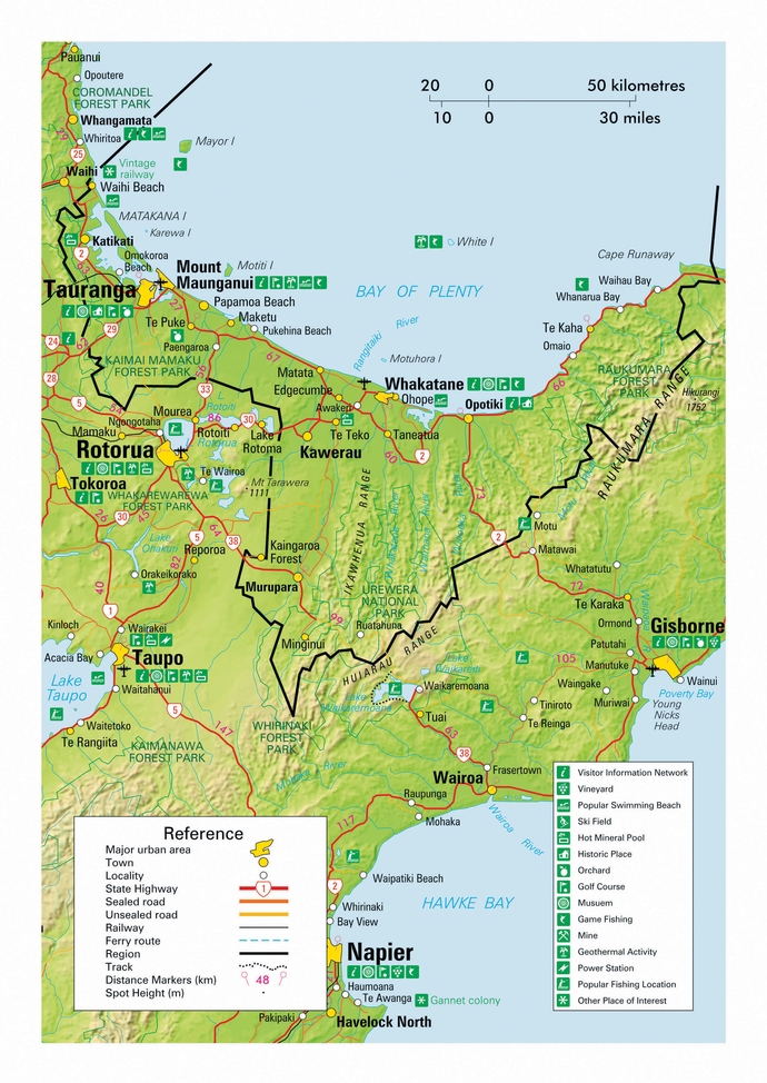 Una de las poblaciones importantes en esta región es Tauranga, ubicada en un hermoso puerto natural, es un centro próspero, con dos grandes puertos deportivos que albergan más de mil yates y lanchas y donde poder alquilar un bote para dar un paseo y llegar a las aguas del marlin en alta mar.