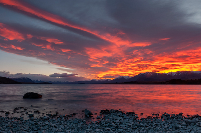 El lago Tekapo es uno de los lugares más bellos de Nueva Zelanda. Y el atardecer aquí es aún más hermoso que el amanecer. Suele estar bastante lleno de turistas así que mejor dirigirse a zonas menos turísticas como puede ser la zona de las aguas termales y ver una hermosa puesta de sol sobre los árboles, o cerca de la famosa Iglesia del Buen Pastor de Tekapo.