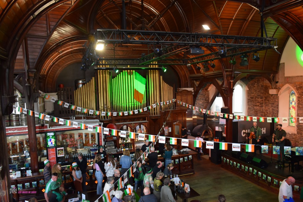 Teníamos 237 kilómetros que hicimos bastante “rápido”, la carretera era buena. Aparcamos en un parking de pago y buscamos un lugar donde comer. Resulta que el 17 de marzo es el día de San Patricio y vimos una iglesia / bar donde parecía que se estaba haciendo una celebración. Entramos a ver que se cocía. El local muy curioso, es una iglesia que la han habilitado como bar donde también poder comer algo, descartamos esta opción por la música, estaba muy fuerte y se hacía muy desagradable, aunque había un gran ambiente, todos con algo de color verde, como manda San Patricio.