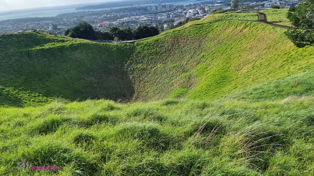 En este viaje no visitamos ninguna de las atracciones de Auckland por dos motivos, la primera fue por falta de tiempo y la segunda porque pensamos que circular por el centro de Auckland y encontrar aparcamiento con la autocaravana iba a resultar muy complicado. Así que decidimos solo ver la ciudad desde el Mount Eden, un volcán inactivo, que ofrece algunas de las mejores vistas de Auckland. Desde su cima, puedes disfrutar de una vista panorámica de la ciudad y sus alrededores. El cráter del volcán, de 50 metros de profundidad, los maoríes lo conocen como Te Ipu-a-Mataaho, el cuenco de Mataaho, el dios de los terremotos y los volcanes. Es una impresionante muestra de la geología volcánica de la región. Es importante señalar que el cráter todavía se considera tapu (sagrado) para los maoríes. Han pasado unos 15.000 años desde la última erupción del volcán.
